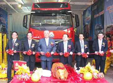 中国重汽(香港)有限公司董事局主席马纯济,执行董事、副总裁韦志海,香港资本公司总经理林东明;大昌行集团执行总裁叶满堂, 大昌行集团董事葛创基,合德公司总经理何建平共同为4S店开业剪彩。