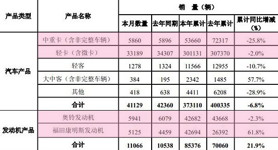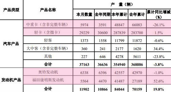1-7福田累计生产中重卡(含非完整车辆)48847辆,累计同比减少26.1%;轻卡(含微卡)287839辆,累计同比增长1.5%;累计销售中重卡(含非完整车辆)53660辆,累计同比减少25.8%;轻卡(含微卡)301131辆,累计同比减少2%。